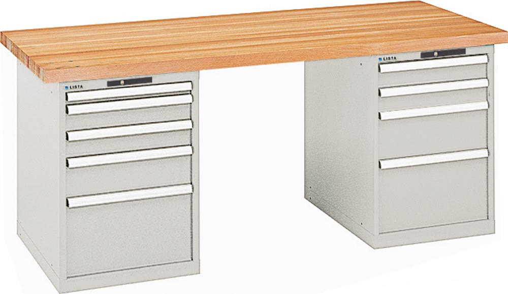 Werkbank, 2 Schubladenblöcke, links 5, rechts 4 Schubladen, elektr. Zahlenschloss, Buchepl. 50 mm, BxTxH 2000x800x850 mm, RAL 5012