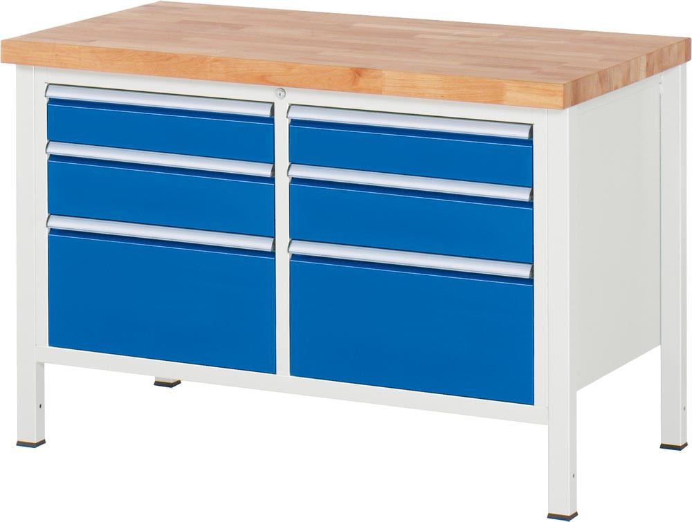 Werkbank, BxTxH 1250x700x840-1040 mm, 6 Schubladen: 2x120/2x150/2x270 mm, Platte Buche 40 mm RAL 7035/5010