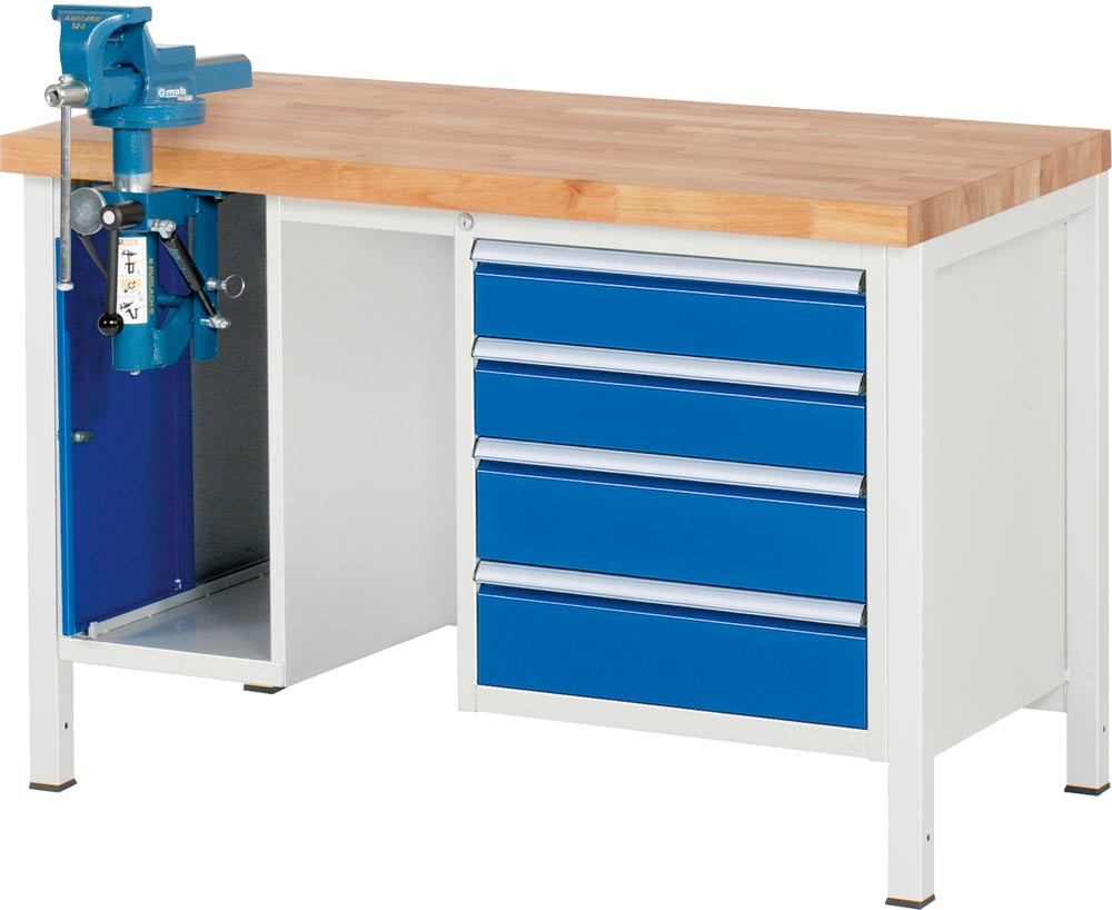Werkbank, BxTxH 1250x700x840-1040 mm, Platte Buche, 4 Schubl.: 2 x 120/2 x 150 mm, 1 Schraubstockschrank, Schraubstock m. Klapplift, RAL7035/5010 E6490687