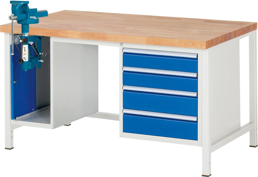 Werkbank, BxTxH 1500x900x840-1040 mm, Platte Buche, 4 Schubl.: 2 x 120/2 x 150 mm, 1 Schraubstockschrank, Schraubstock m. Klapplift, RAL7035/5010