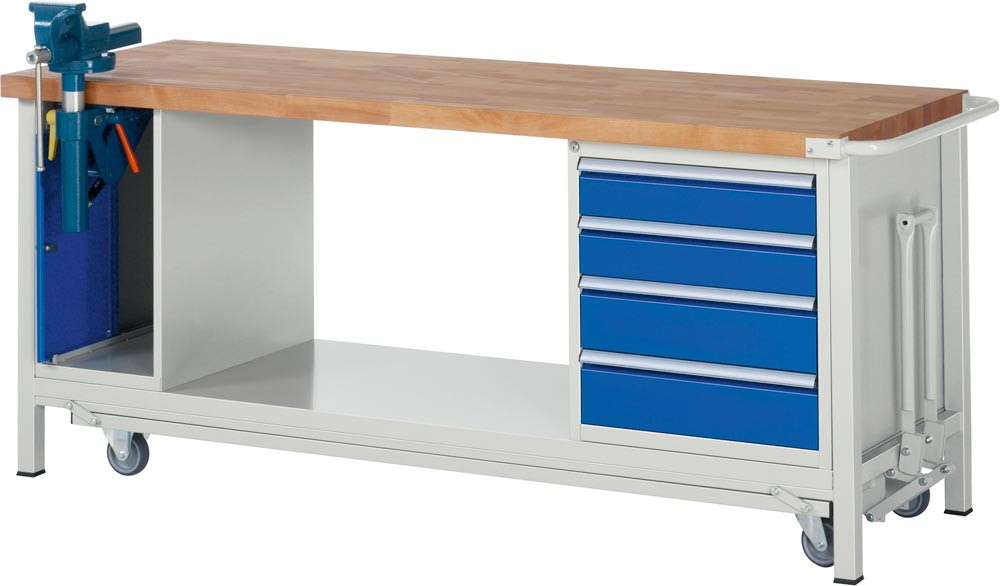 Werkbank mit absenkb. Fahrgest., BxTxH 2000x700x880 mm, 4 Schubl.: 2x120/2x150 mm, 1 Schraubstockschr., Platte Buche 40 mm, RAL 7035/5010