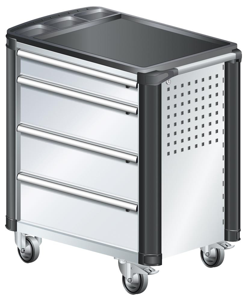Werkstattwagen, 4 Schubladen: 1x100, 3x200 mm VA, BxTxH 894x525x928 mm, Kunststoffabdeckung, Kantenschutz, fahrbar, RAL 7035 E6011381