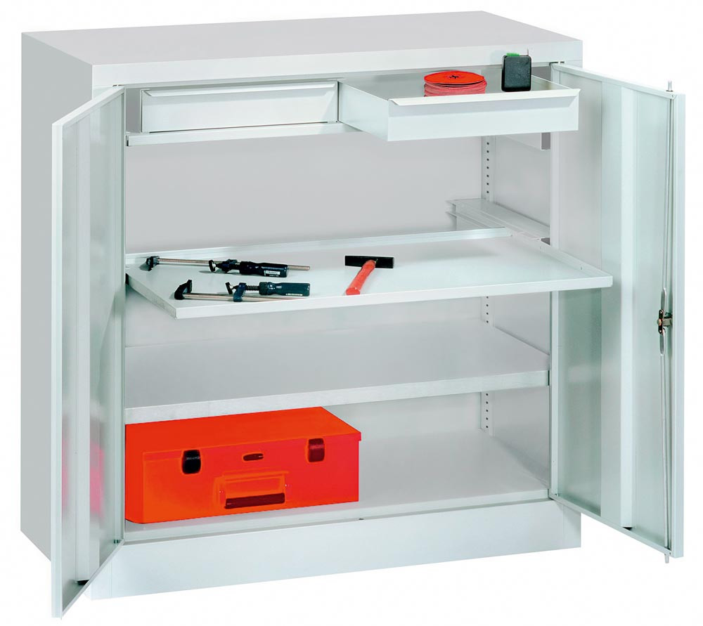 Werkzeugschrank, Vollblechtüren, 1 beschichteter Boden, 1 Auszugboden, 2 Schubl. 75 mm, BxTxH 1000x500x1000 mm, RAL 7035