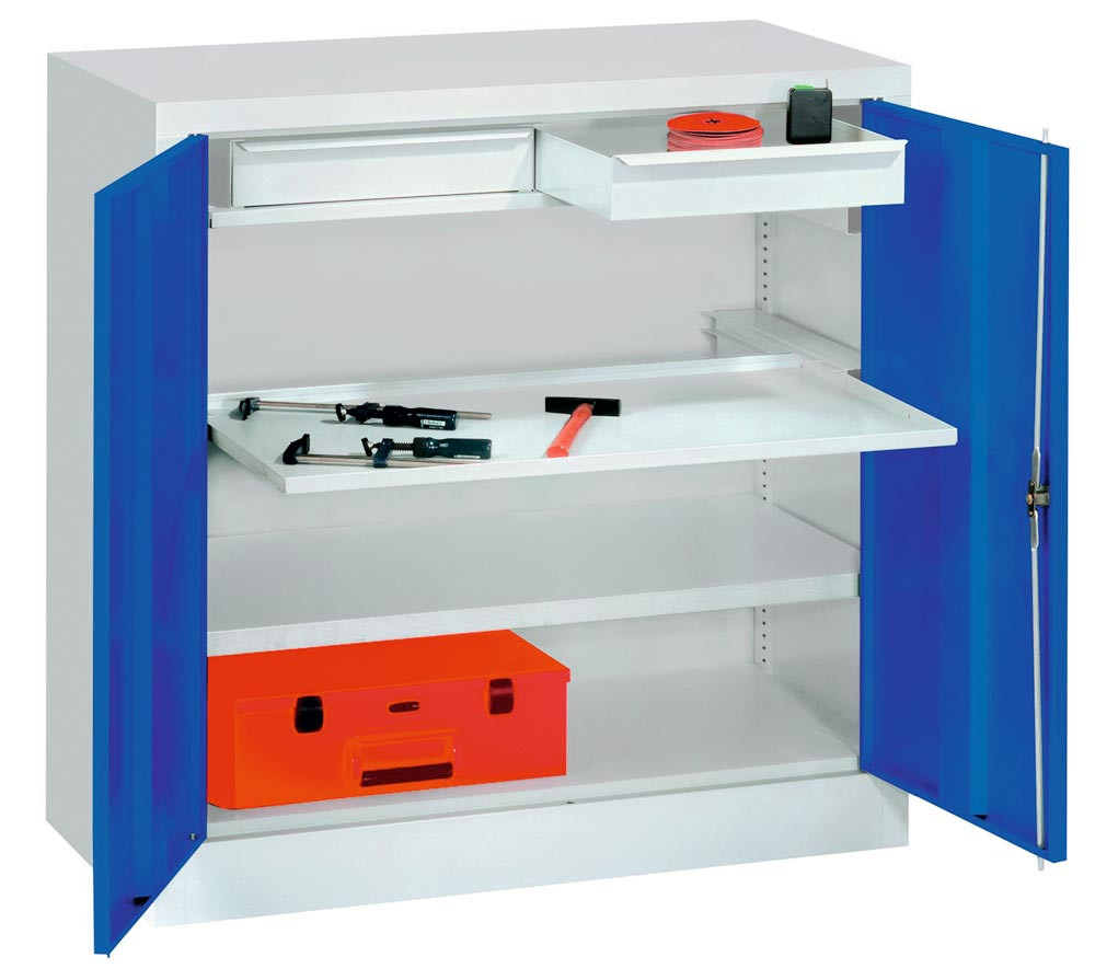 Werkzeugschrank, Vollblechtüren, 1 beschichteter Boden, 1 Auszugboden, 2 Schubl. 75 mm, BxTxH 1000x500x1000 mm, RAL 7035/5010