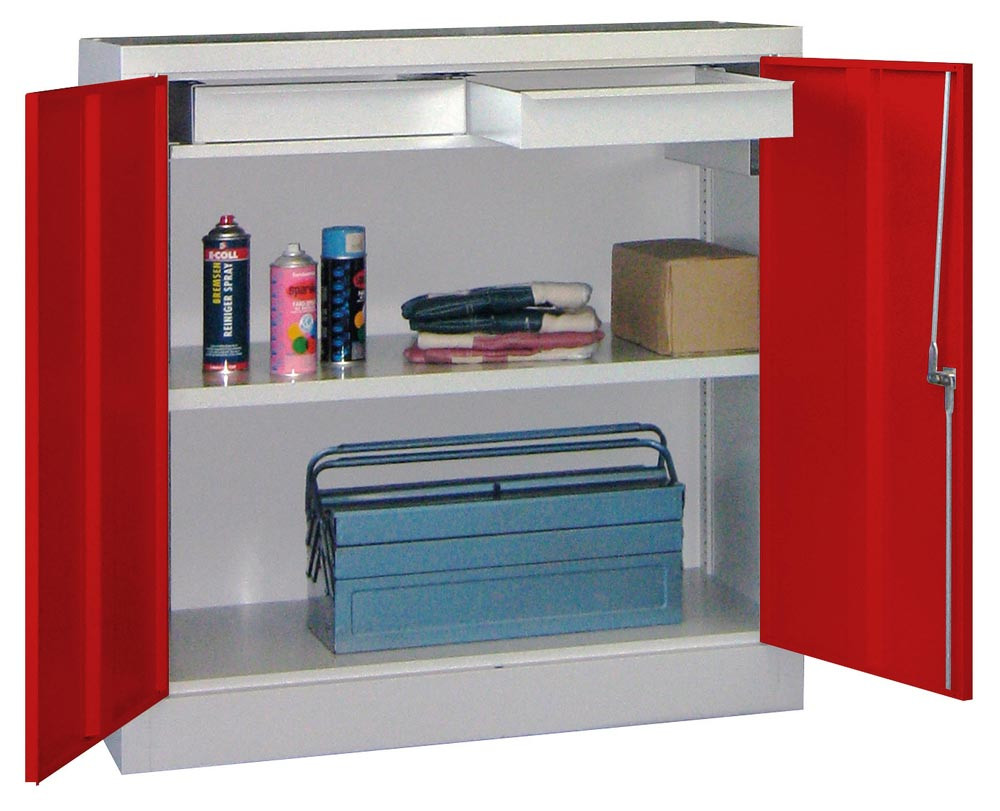 Werkzeugschrank, Vollblechtüren, 1 beschichteter Boden, 2 Schubladen 75 mm, BxTxH 1000x500x1000 mm, RAL 7035/3000