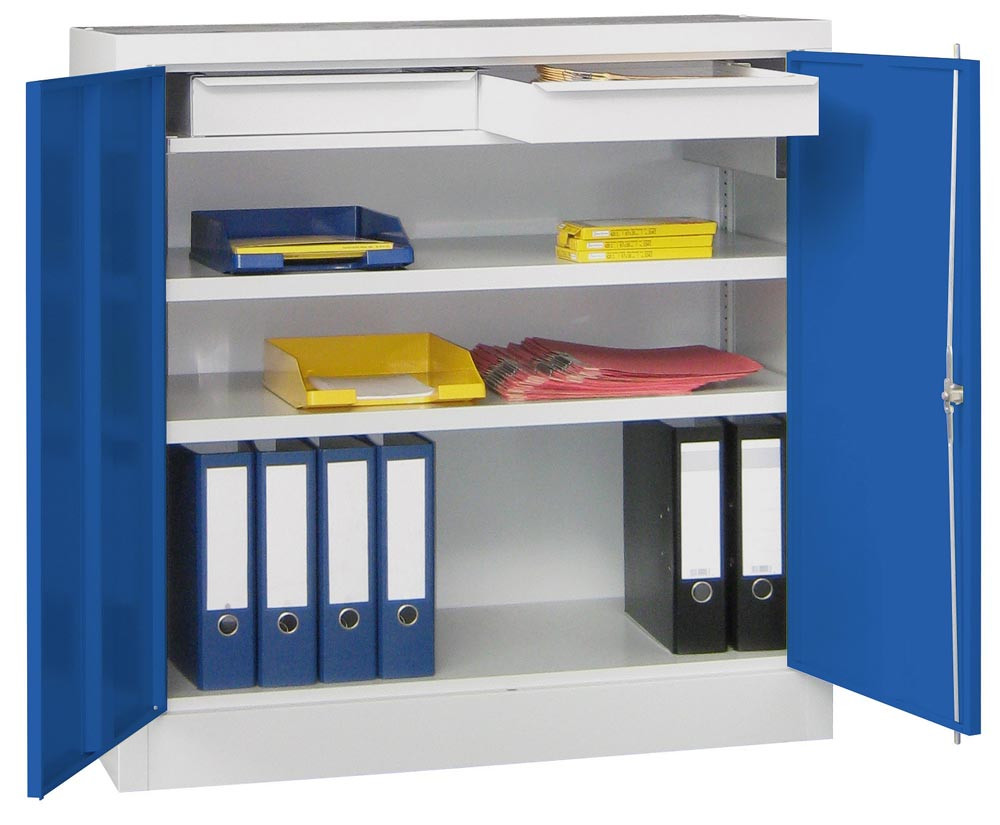 Werkzeugschrank, Vollblechtüren, 2 beschichtete Böden, 2 Schubladen 75 mm, BxTxH 1000x500x1000 mm, RAL 7035/5010