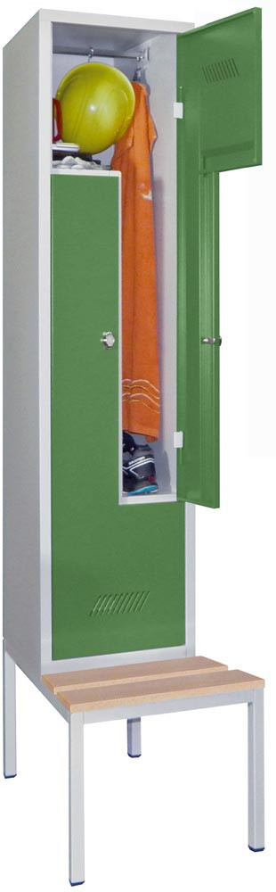Z-Garderobenschränke auf untergebauter Sitzbank finden überall dort Verwendung, wo der Platz nur für einen Garderobenschrank mit 2 Abteilen übereinander ausreicht, aber trotzdem längere Kleidungsstücke untergebracht werden müssen. · Stabile, verschweißte Stahlblechkonstruktion mit Lüftungsschlitzen in den Türen ∙ Einschlagende Türen mit Verstärkungstaschen und Drehriegelverschluss ∙ Je Abteil 1 Kleiderstange und 3 Kleiderhaken · Untergebaute Sitzbank auf Vierkantrohrgestell, Lackierung RAL 7035 lichtgrau ∙ Füße mit Niveau-Ausgleich ∙ Sitzhöhe 430 mm bei Kunststoffleisten, 420 mm bei Holzleisten