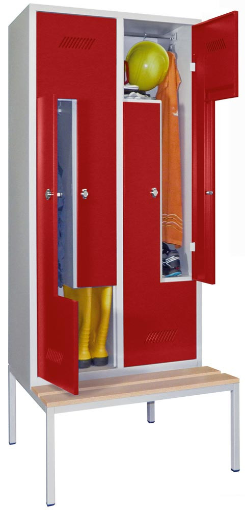 Z-Garderobenschränke auf untergebauter Sitzbank finden überall dort Verwendung, wo der Platz nur für einen Garderobenschrank mit 2 Abteilen übereinander ausreicht, aber trotzdem längere Kleidungsstücke untergebracht werden müssen. · Stabile, verschweißte Stahlblechkonstruktion mit Lüftungsschlitzen in den Türen ∙ Einschlagende Türen mit Verstärkungstaschen und Drehriegelverschluss ∙ Je Abteil 1 Kleiderstange und 3 Kleiderhaken · Untergebaute Sitzbank auf Vierkantrohrgestell, Lackierung RAL 7035 lichtgrau ∙ Füße mit Niveau-Ausgleich ∙ Sitzhöhe 430 mm bei Kunststoffleisten, 420 mm bei Holzleisten