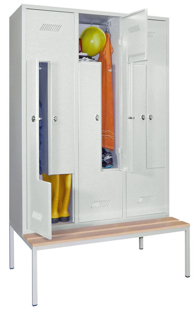 Z-Garderobenschränke auf untergebauter Sitzbank finden überall dort Verwendung, wo der Platz nur für einen Garderobenschrank mit 2 Abteilen übereinander ausreicht, aber trotzdem längere Kleidungsstücke untergebracht werden müssen. · Stabile, verschweißte Stahlblechkonstruktion mit Lüftungsschlitzen in den Türen ∙ Einschlagende Türen mit Verstärkungstaschen und Drehriegelverschluss ∙ Je Abteil 1 Kleiderstange und 3 Kleiderhaken · Untergebaute Sitzbank auf Vierkantrohrgestell, Lackierung RAL 7035 lichtgrau ∙ Füße mit Niveau-Ausgleich ∙ Sitzhöhe 430 mm bei Kunststoffleisten, 420 mm bei Holzleisten