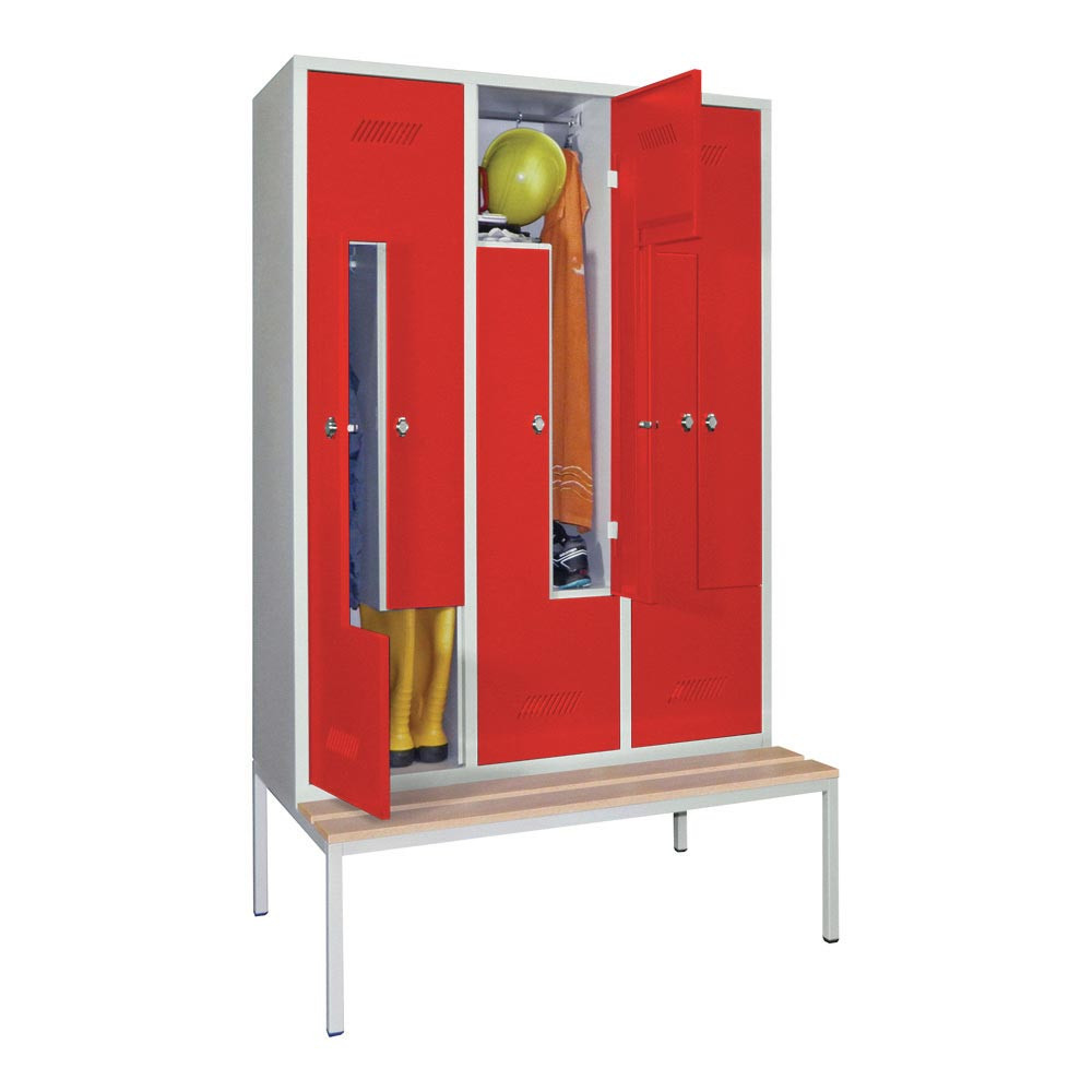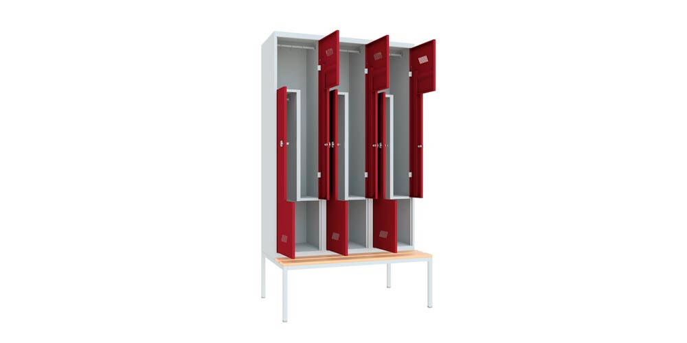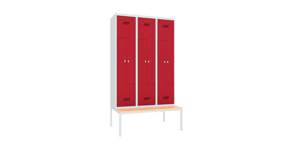 Z-Garderobenschränke auf untergebauter Sitzbank finden überall dort Verwendung, wo der Platz nur für einen Garderobenschrank mit 2 Abteilen übereinander ausreicht, aber trotzdem längere Kleidungsstücke untergebracht werden müssen. · Stabile, verschweißte Stahlblechkonstruktion mit Lüftungsschlitzen in den Türen ∙ Einschlagende Türen mit Verstärkungstaschen und Drehriegelverschluss ∙ Je Abteil 1 Kleiderstange und 3 Kleiderhaken · Untergebaute Sitzbank auf Vierkantrohrgestell, Lackierung RAL 7035 lichtgrau ∙ Füße mit Niveau-Ausgleich ∙ Sitzhöhe 430 mm bei Kunststoffleisten, 420 mm bei Holzleisten
