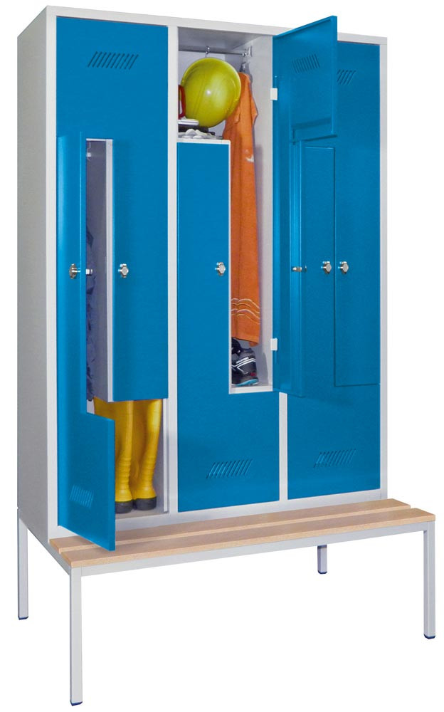 Z-Garderobenschränke auf untergebauter Sitzbank finden überall dort Verwendung, wo der Platz nur für einen Garderobenschrank mit 2 Abteilen übereinander ausreicht, aber trotzdem längere Kleidungsstücke untergebracht werden müssen. · Stabile, verschweißte Stahlblechkonstruktion mit Lüftungsschlitzen in den Türen ∙ Einschlagende Türen mit Verstärkungstaschen und Drehriegelverschluss ∙ Je Abteil 1 Kleiderstange und 3 Kleiderhaken · Untergebaute Sitzbank auf Vierkantrohrgestell, Lackierung RAL 7035 lichtgrau ∙ Füße mit Niveau-Ausgleich ∙ Sitzhöhe 430 mm bei Kunststoffleisten, 420 mm bei Holzleisten