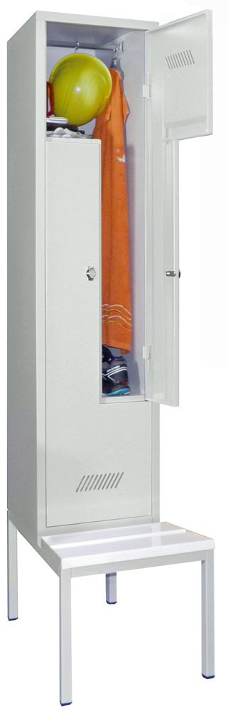 Z-Garderobenschränke auf untergebauter Sitzbank finden überall dort Verwendung, wo der Platz nur für einen Garderobenschrank mit 2 Abteilen übereinander ausreicht, aber trotzdem längere Kleidungsstücke untergebracht werden müssen. · Stabile, verschweißte Stahlblechkonstruktion mit Lüftungsschlitzen in den Türen ∙ Einschlagende Türen mit Verstärkungstaschen und Drehriegelverschluss ∙ Je Abteil 1 Kleiderstange und 3 Kleiderhaken · Untergebaute Sitzbank auf Vierkantrohrgestell, Lackierung RAL 7035 lichtgrau ∙ Füße mit Niveau-Ausgleich ∙ Sitzhöhe 430 mm bei Kunststoffleisten, 420 mm bei Holzleisten