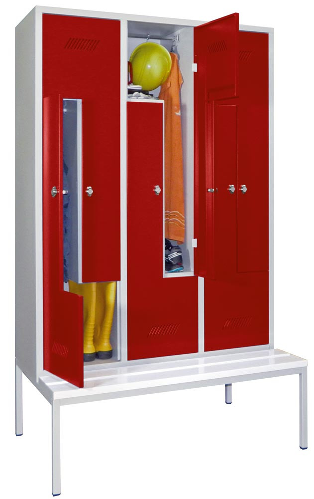 Z-Garderobenschränke auf untergebauter Sitzbank finden überall dort Verwendung, wo der Platz nur für einen Garderobenschrank mit 2 Abteilen übereinander ausreicht, aber trotzdem längere Kleidungsstücke untergebracht werden müssen. · Stabile, verschweißte Stahlblechkonstruktion mit Lüftungsschlitzen in den Türen ∙ Einschlagende Türen mit Verstärkungstaschen und Drehriegelverschluss ∙ Je Abteil 1 Kleiderstange und 3 Kleiderhaken · Untergebaute Sitzbank auf Vierkantrohrgestell, Lackierung RAL 7035 lichtgrau ∙ Füße mit Niveau-Ausgleich ∙ Sitzhöhe 430 mm bei Kunststoffleisten, 420 mm bei Holzleisten