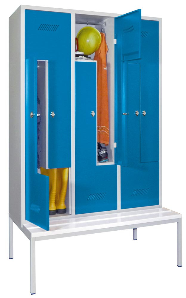 Z-Garderoben, untergeb. Sitzbank Kunststoffleiste, 2 Abteile, BxTxH 400x500/800x2150 mm, Drehriegel, RAL 7035/5010 E6422586