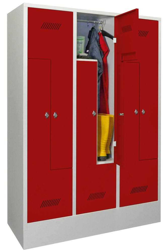 Z-Garderobenschränke finden überall dort Verwendung, wo der Platz nur für einen Garderobenschrank mit 2 Abteilen übereinander ausreicht, aber trotzdem längere Kleidungsstücke untergebracht werden müssen.