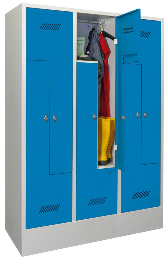 Z-Garderobenschränke finden überall dort Verwendung, wo der Platz nur für einen Garderobenschrank mit 2 Abteilen übereinander ausreicht, aber trotzdem längere Kleidungsstücke untergebracht werden müssen.