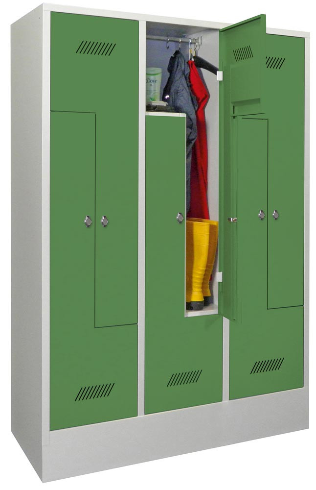 Z-Garderobenschränke finden überall dort Verwendung, wo der Platz nur für einen Garderobenschrank mit 2 Abteilen übereinander ausreicht, aber trotzdem längere Kleidungsstücke untergebracht werden müssen.