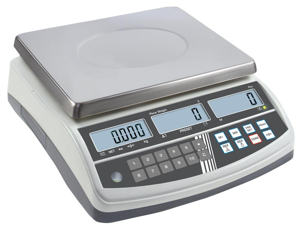 ∙ Gehäuse aus bruchsicherem Kunststoff ∙ Mit großer Edelstahl-Wägeplatte ∙ Drei hinterleuchtete LCD-Displays (Ziffernhöhe 20 mm) für Gewichtsanzeige, Referenzgewicht und Gesamtstückzahl ∙ Zulässige Umgebungstemperatur 0 bis +40°C ∙ 230 Volt Anschluss, Netzadapter serienmäßig ∙ Kalibrierung optional auf Anfrage