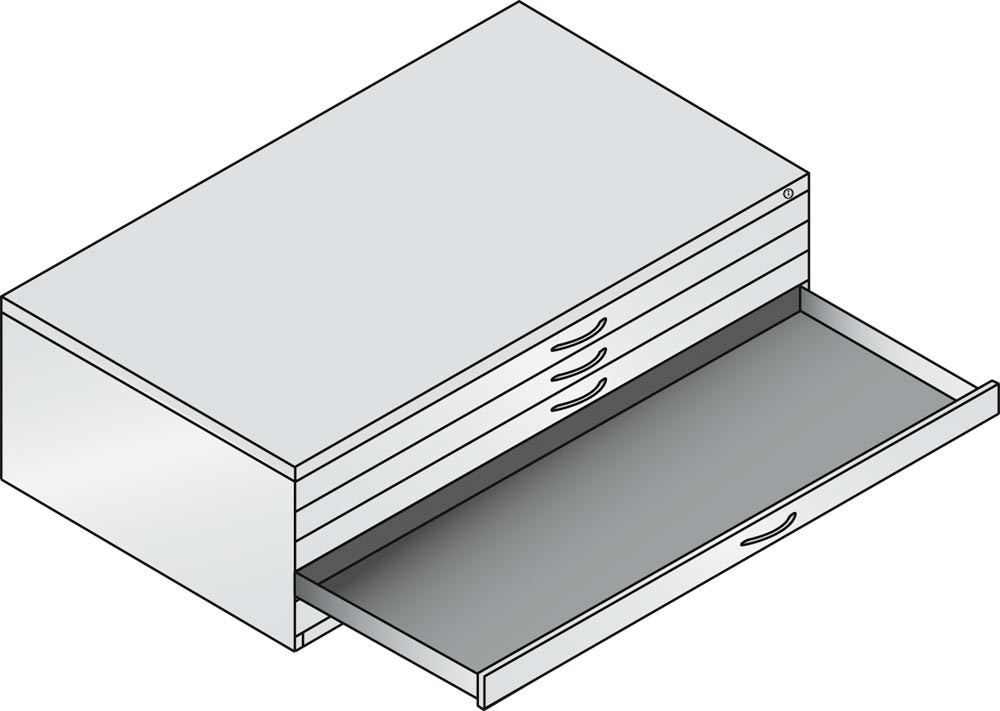 ∙ Stabile Stahlblechkonstruktion mit hochwertiger Einbrennlackierung ∙ Für Formate DIN A1 bis DIN A0 ∙ Leichtlaufende Schubladen auf Kugelrollenteleskopschienen, vorn mit Niederhalter, hinten mit Deckleiste, lichte Innenhöhe 55 mm ∙ Gelochte Schubladenböden zur Unterteilung ∙ DIN A0 zu 4/5, DIN A1 voll ausziehbar ∙ Geräuscharmes Schließen durch das ESE-System (End-Selbst-Einzug) ∙ Schubladen mit Auszugsperre gegen das gleichzeitige Öffnen von mehreren Schubladen zur Verhinderung der Kippgefahr ∙ Zentral verschließbar durch Sicherheitsschloss mit 2 Schlüsseln ∙ Formschöne, mattverchromte Bügelgriffe ∙ Traglast ca. 40 kg/Schublade ∙ Abdeckplatte, 25 mm stark und Sockel 100 mm hoch, gegen Mehrpreis